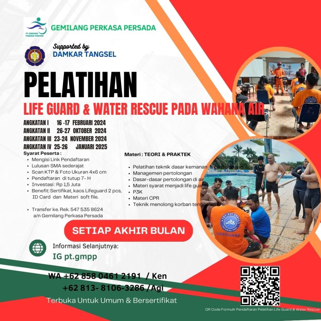 Pelatihan Khusus Life Guard & Water Rescue pada Wahana Air, Lokasi pelatihan di kolam renang Duta Bintaro, Kota Tangerang . Hubungi kami : di +62 858 0461 2191 atau +62 813 8106 3286. Dengan Investasi hanya Rp 1,5 juta / peserta include : Sertifikat, Kaos Lifeguard 2 pcs, ID Card dan Materi Soft file.